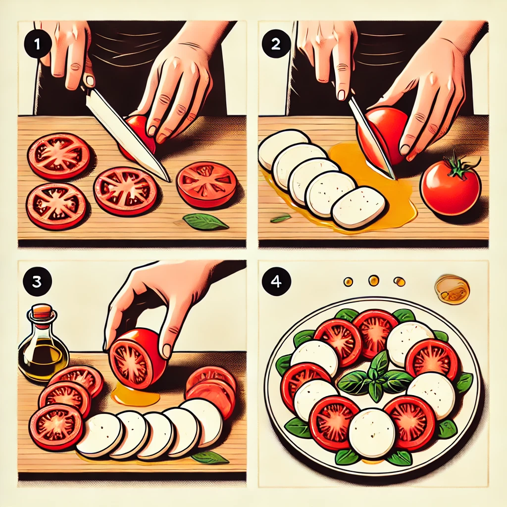 - 토마토와 치즈를 번갈아 가며 접시에 배열한다.